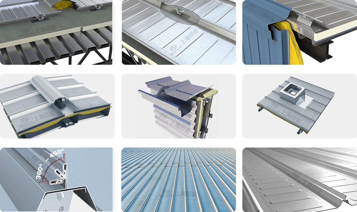 360°直立縫屋面系統,連接處涂密封膠,屋面板連接采用360度雙鎖卷邊技術,實現極佳的水密、氣密性以及優異的抗風雨性能。
